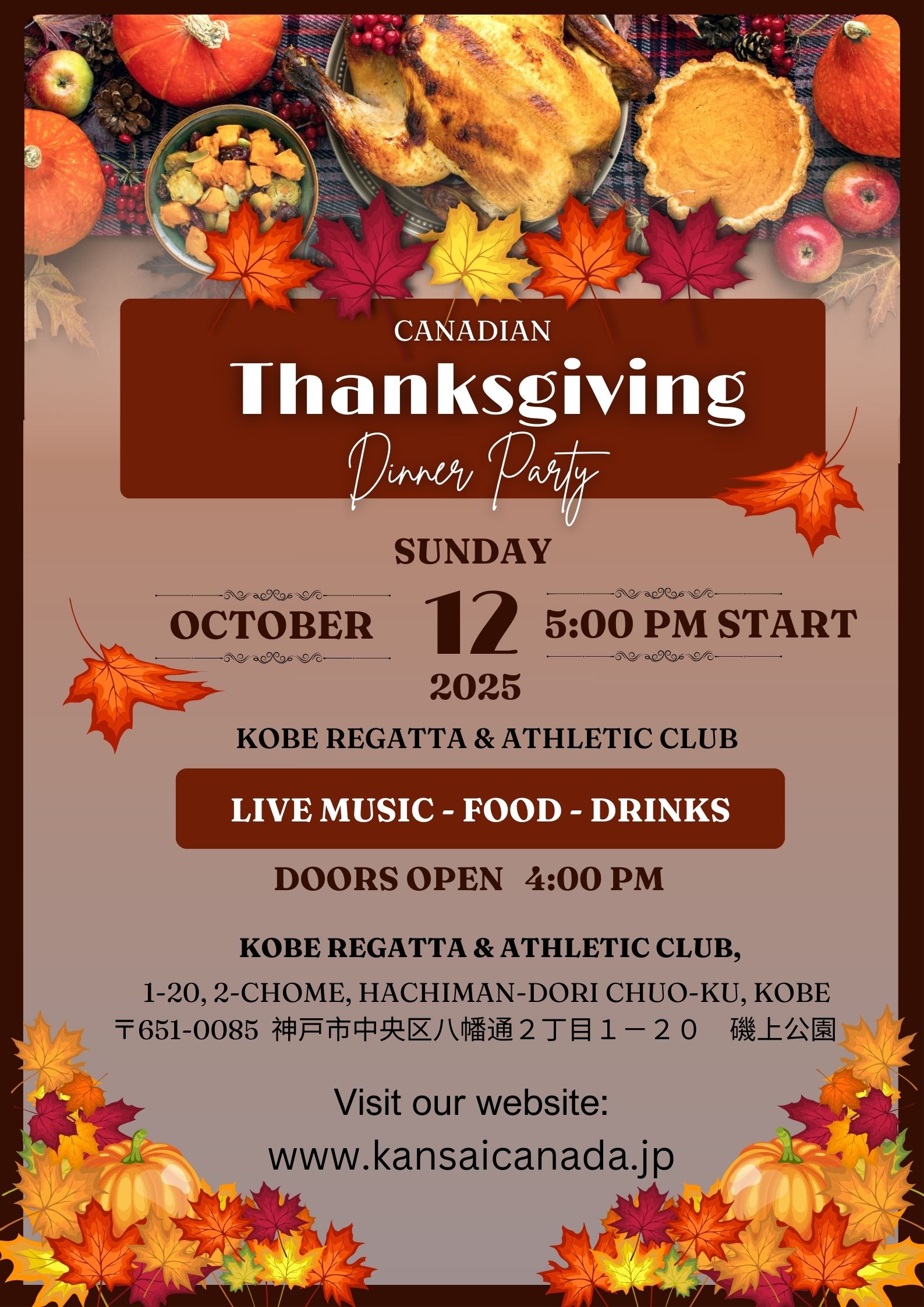 Canadian Thanksgiving Celebration Dinner 2025 日曜日 10月 12日, 2025年: 4:00 PM~8:00 PM ※お申込に関するお願い! Googleフ … 続きを読む >Canadian Thanksgiving Celebration Dinner 2025